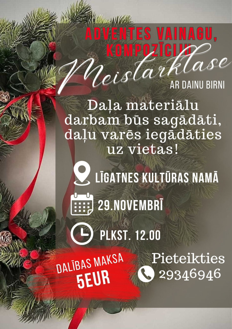 Sestdien, 29. novembrī, plkst. 12.00 Līgatnes Kultūras namā aicinām pievienoties meistarklasē “Adventes vainagi un kompozīcijas”, kur kopā ar Dainu Birni būs iespēja radīt skaistus un unikālus svētku dekorus.