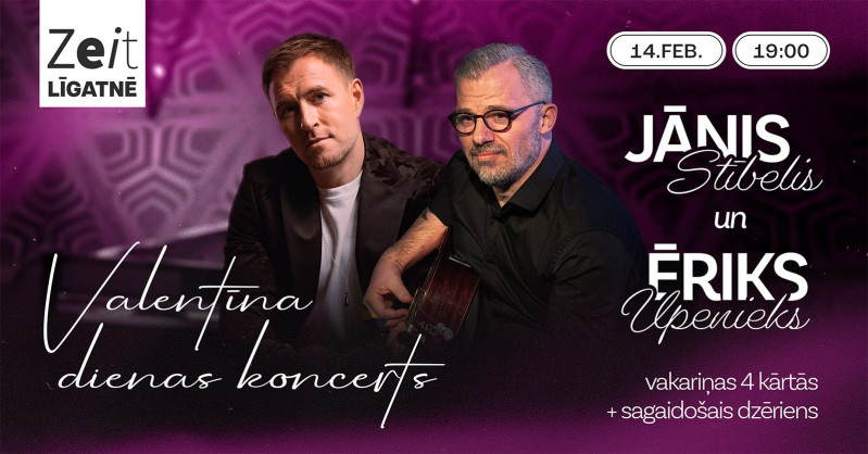 Visu mīlētāju dienā, 14. februārī plkst. 19.00 radošais kvartāls “Zeit” ielūdz uz muzikālām 4 kārtu vakariņām romantiskās noskaņās. Par muzikālo noformējumu parūpēsies atraktīvais dziedātājs Jānis Stībelis un ģitāras meistars Ēriks Upenieks, uzburot īpašu skaistu atmosfēru. Pārsteidz savu otro pusīti ar neaizmirstamu vakaru un tiekamies!