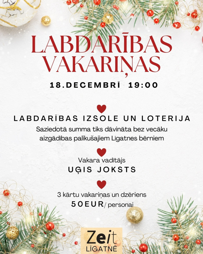 Pirmssvētku nedēļā, 18. decembrī plkst. 19.00 radošais kvartāls “Zeit” aicina uz Labdarības vakariņām. Šī pasākuma mērķis ir atbalstīt Līgatnes bērnus, kas palikuši bez vecāku apgādības.
