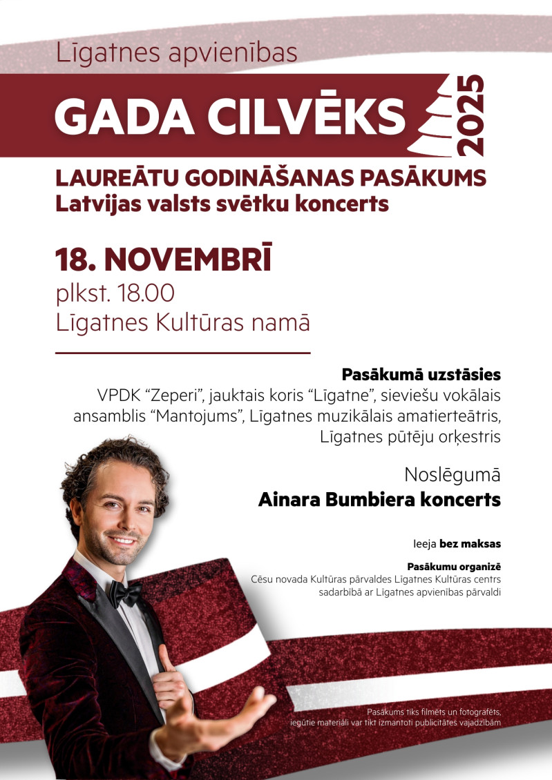 Latvijas Republikas proklamēšanas 107. gadadienā, 18. novembrī, plkst. 18.00 Līgatnes Kultūras namā aicinām svinēt Latvijas valsts svētkus kopā! Pasākumā tiks godināti Līgatnes apvienības “Gada cilvēks 2025” laureāti.