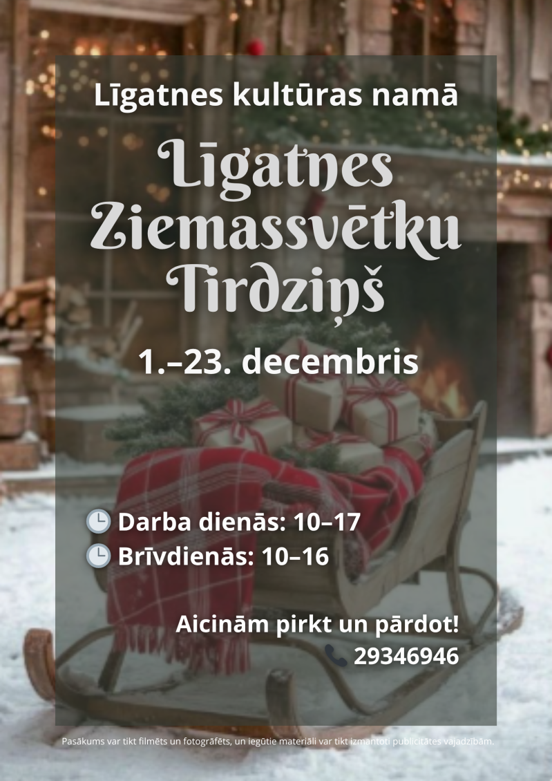 Ziemassvētku tirdziņš pircējus un pārdevējus gaidīs Līgatnes Kultūras namā no 1. decembra līdz 23. decembrim darba dienās plkst. 10.00 – 17.00 un brīvdienās plkst. 10.00 – 16.00.