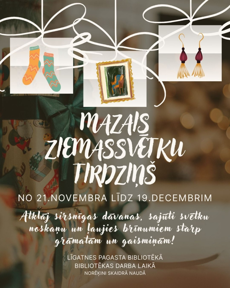 No 21. novembra līdz 19. decembrim Līgatnes pagasta bibliotēkā pirmo reizi notiks Mazais Ziemassvētku tirdziņš, kas aicinās ikvienu sajust svētku tuvošanos un atrast skaistas, ar rūpību un mīlestību radītas dāvanas.