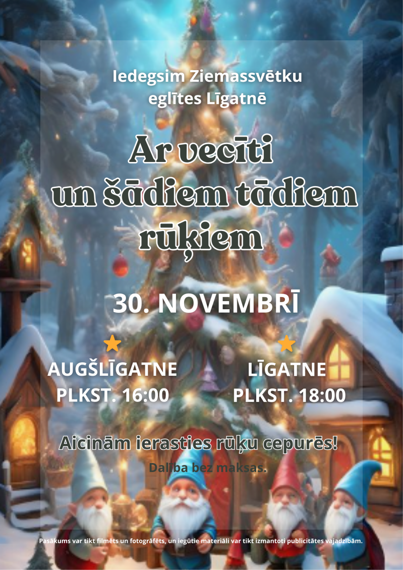 Aicinām ikvienu uz sirsnīgu, jautru un gaismas piepildītu pasākumu kopā ar čaklajiem rūķiem, kuri palīdzēs modināt Līgatnes apvienību skaistajai svētku noskaņai.