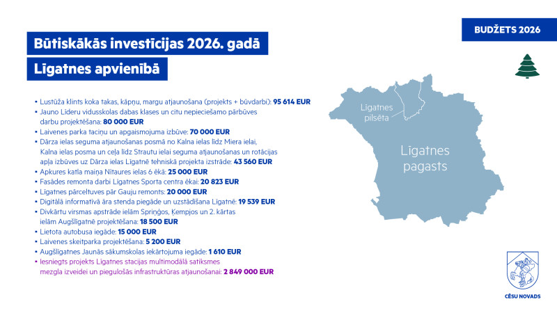 Līgatnes apvienības pārvaldes vadītāja Liene Krīvena par šī gada budžetu norāda: “2026. gada budžeta fokusā ir teritorijas un infrastruktūras uzlabojumi, lai nodrošinātu kvalitatīvu vidi gan iedzīvotājiem ikdienā, gan viesu apmeklējumiem Līgatnē un Augšlīgatnē.