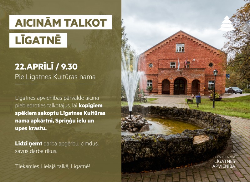 Līgatnes apvienības pārvalde aicina piebiedroties talkotājus, lai kopīgiem spēkiem sakoptu Līgatnes Kultūras nama apkārtni, Spriņģu ielu un upes krastu. Talkošana norisināsies Lielās talkas laikā, 22.aprīlī, no plkst.9.30.