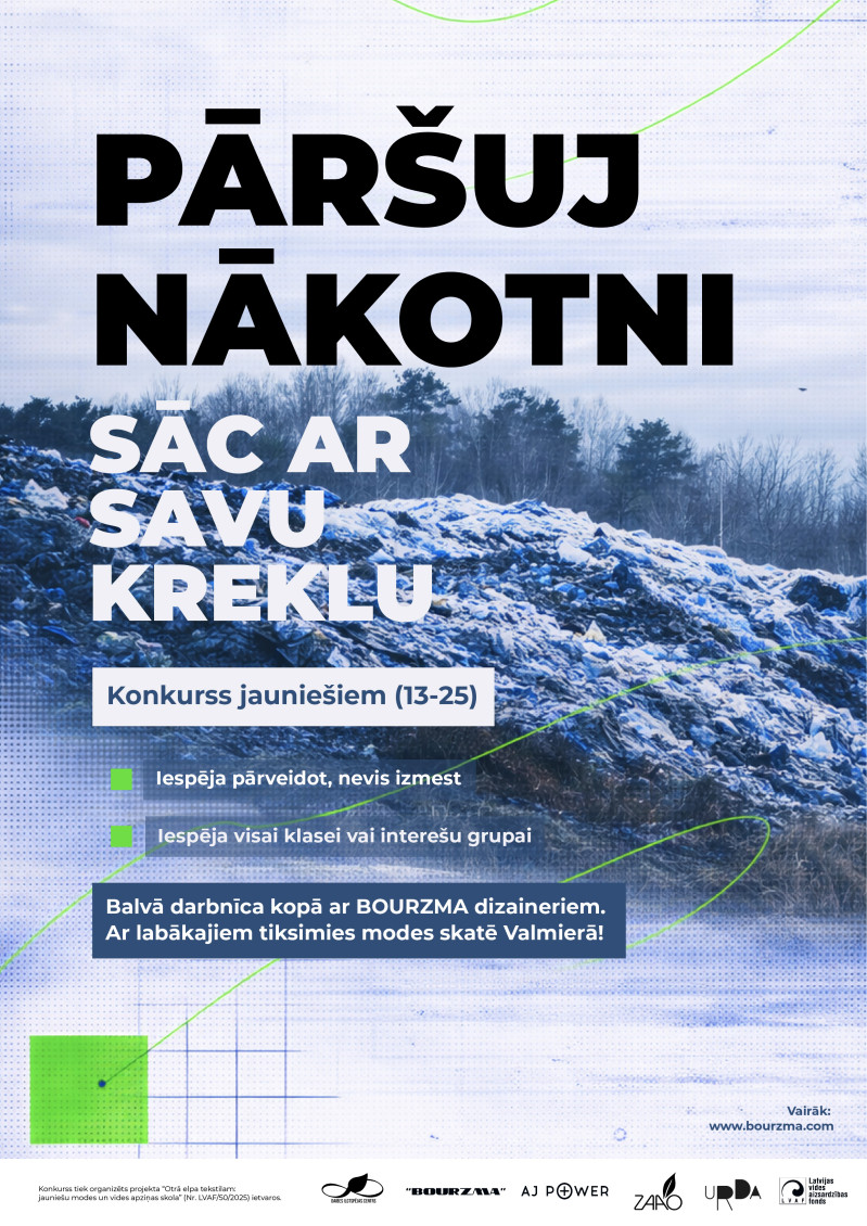 Ātrā mode rada arvien vairāk atkritumu, jauniešus aicina “pāršūt nākotni” Izsludināts radošs konkurss jauniešiem “Pāršuj nākotni: sāc ar savu kreklu”. Konkursa mērķis ir veicināt izpratni par tekstila ietekmi uz vidi un iedvesmot paskatīties uz apģērbu citādi - nevis kā uz lietu, ko izmest, bet kā uz resursu jaunām idejām. Konkurss tiek īstenots sadarbībā ar ilgtspējas modes platformu “BOURZMA”, kuras dizaineri strādās kopā ar jauniešiem astoņās praktiskajās darbnīcās, palīdzot idejas pārvērst unikālos un valkājamos dizainos. “Ilgtspējīga mode sākas domāšanā. Mums ir svarīgi parādīt jauniešiem, ka viņi var būt pārmaiņu veidotāji, ne tikai patērēt, bet arī radīt. Šis projekts ir par to, kā no viena krekla var sākties pilnīgi jauns stāsts, un vienlaikus - par drosmi paskatīties savā skapī kritiski un izvērtēt, ko, kā un kāpēc mēs patērējam, ” tā Patriks Kirkils, “BOURZMA” vadītājs.