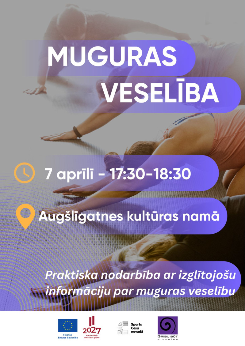 Otrdien, 7. aprīlī, plkst. 17.30 Augšlīgatnes Kultūras namā biedrība “Gribu būt” sadarbībā ar Cēsu novada pašvaldību aicina uz bezmaksas nodarbību par muguras veselību.