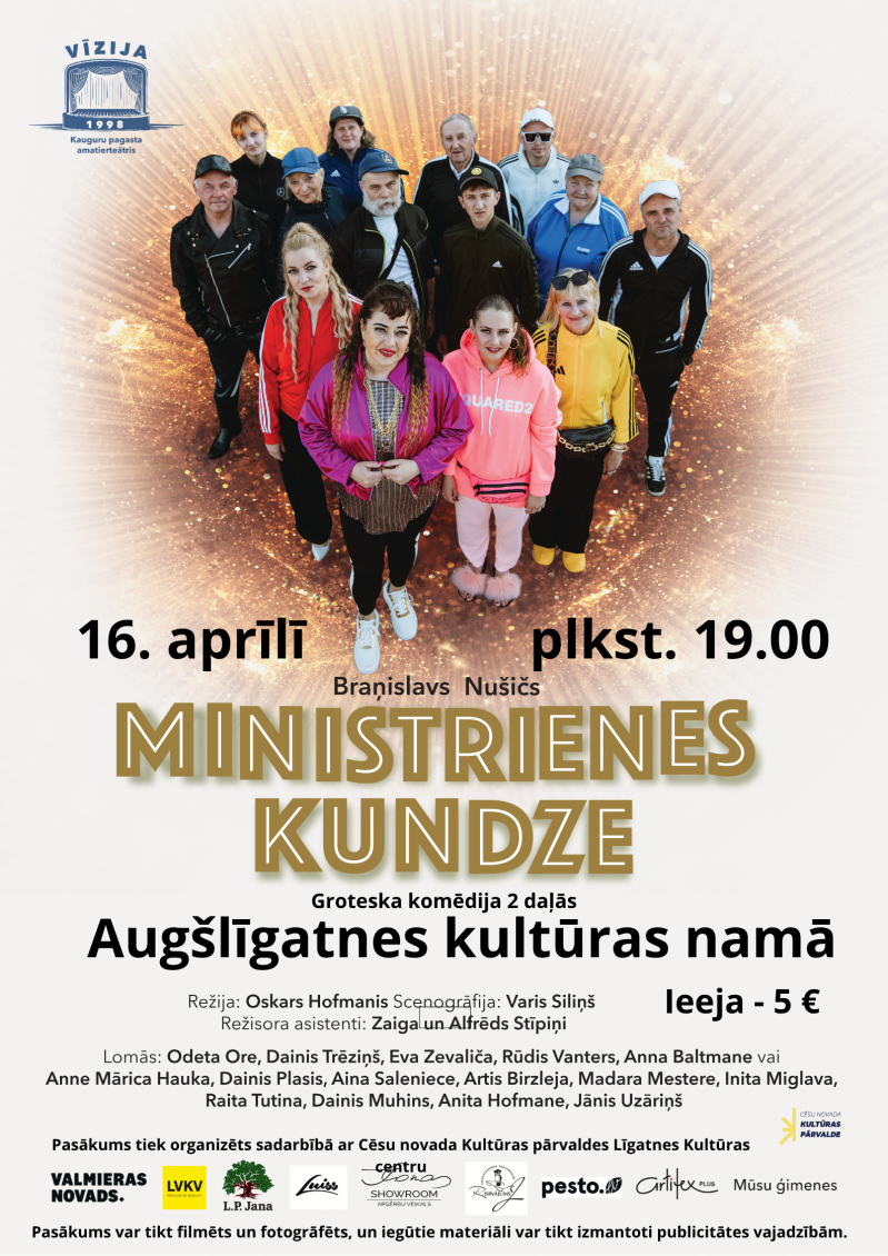 Ceturtdien, 16. aprīlī, plkst. 19.00 Augšlīgatnes Kultūras namā Kauguru pagasta amatierteātris “Vīzija” piedāvā serbu dramaturga Braņislava Nušiča asprātīgo un satīrisko komēdiju “Ministrienes kundze”.