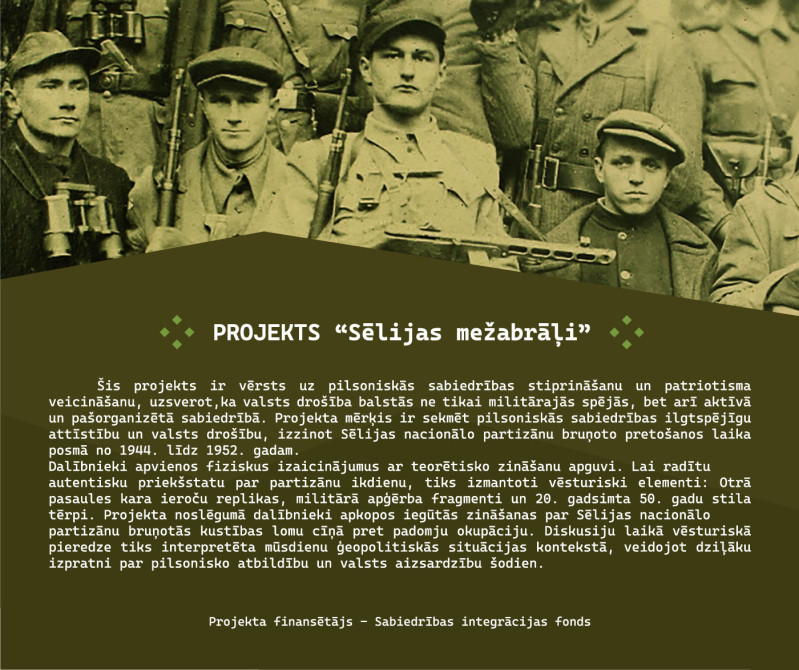 Projekta mērķis ir stiprināt patriotismu un pilsonisko sabiedrību, izzinot Sēlijas nacionālo partizānu bruņoto pretošanos laika posmā no 1944. līdz 1952. gadam.