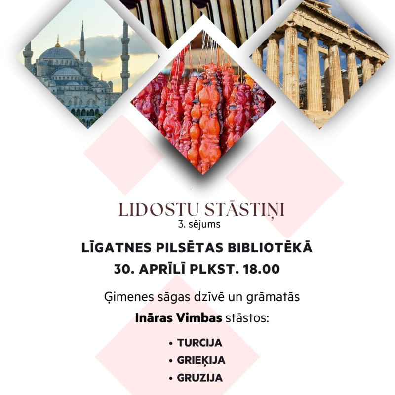Pasākumā Ināra Vimba dalīsies iespaidos un atmiņās no saviem ceļojumiem uz Turciju, Grieķiju un Gruziju.