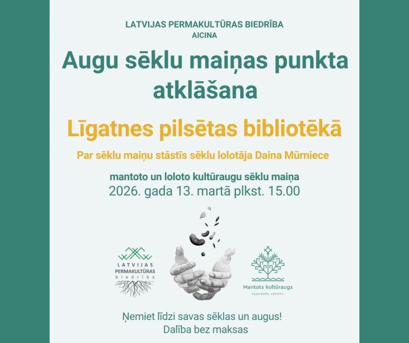 Latvijas Permakultūras biedrība un Līgatnes pilsētas bibliotēka aicina ikvienu interesentu uz Sēklu maiņas punkta atklāšanu 13. martā plkst. 15.00 Līgatnes pilsētas bibliotēkā.
