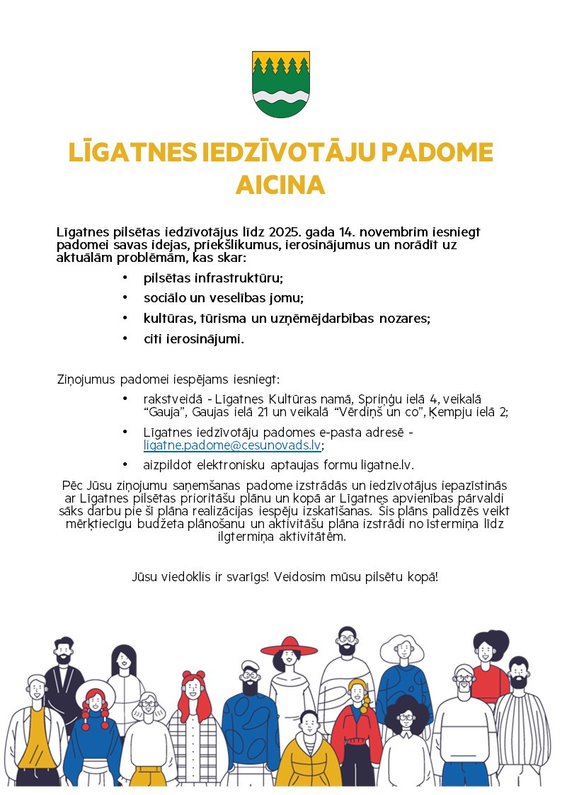 Līgatnes pilsētas iedzīvotāju padome aicina Līgatnes iedzīvotājus līdz 14. novembrim iesniegt padomei savas idejas, priekšlikumus, ierosinājumus un norādīt uz aktuālām problēmām, kas skar pilsētas infrastruktūru, sociālo un veselības jomu, kultūras, tūrisma un uzņēmējdarbības, kā arī citas nozares.