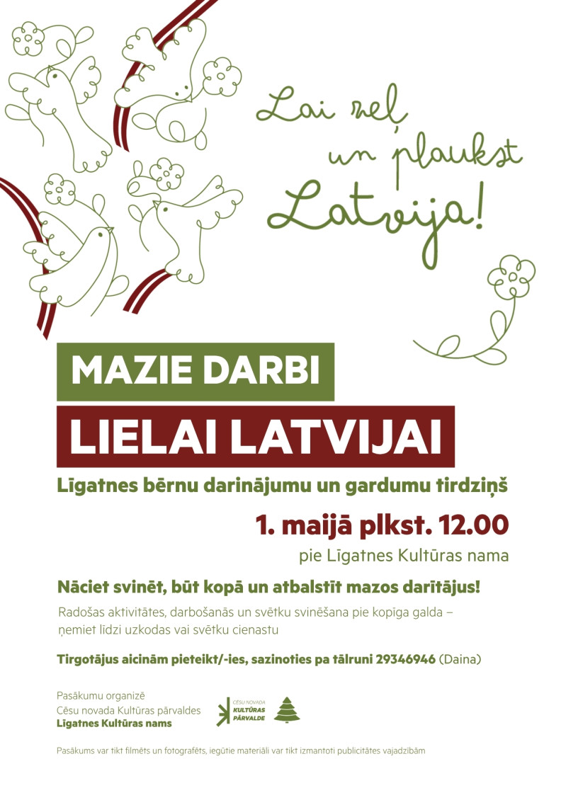 Darba svētkos, 1. maijā, no plkst. 12.00 pie Līgatnes Kultūras nama norisināsies Līgatnes bērnu darinājumu un gardumu tirdziņš.