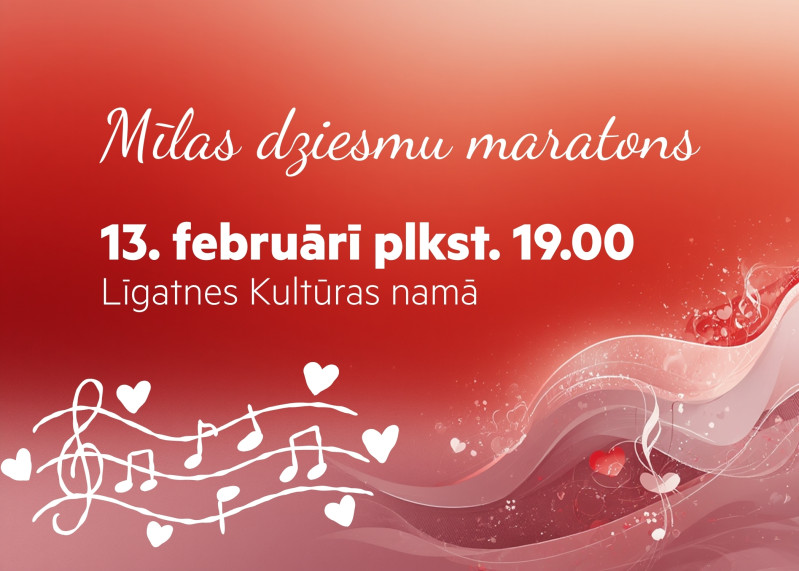Aicinām solistus un mazās muzikālās apvienības (duetus, ansambļus) pieteikt dalību un uzstāties ar savu priekšnesumu mīlas dziesmu maratonā “IzDziedi mīlestību”, kas notiks 13. februārī plkst. 19.00 Līgatnes Kultūras namā.