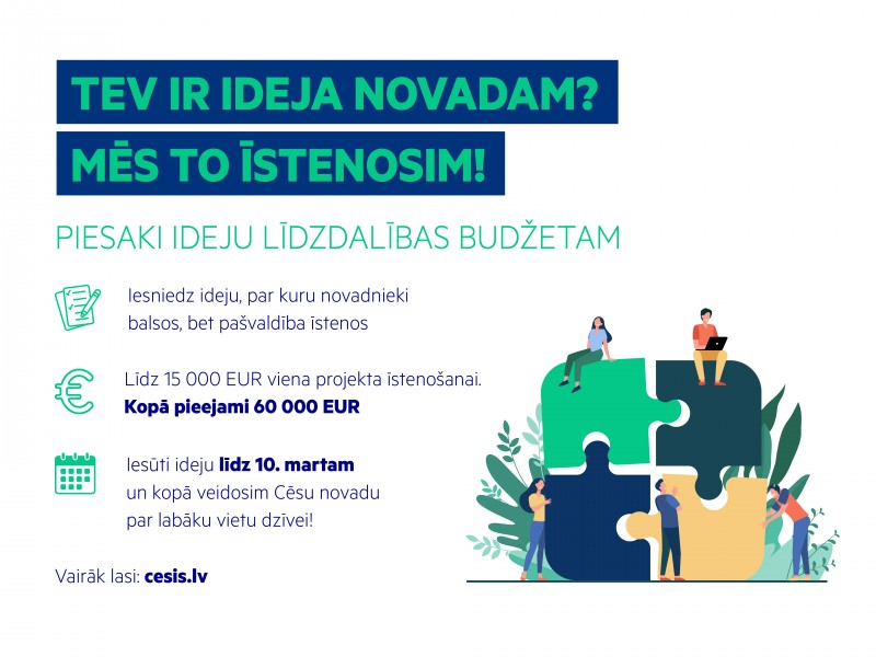 Turpinot sabiedrības iesaisti Cēsu novada attīstībā, izsludinām 2025. gada Cēsu novada līdzdalības budžeta projektu konkursu, aicinot iedzīvotājus iesniegt savas idejas novada attīstībai. Cēsu novadā līdzdalības budžets iedzīvotāju ideju īstenošanai pieejams jau trešo gadu, un šogad tā kopējais apmērs sasniedz 60 000 EUR.