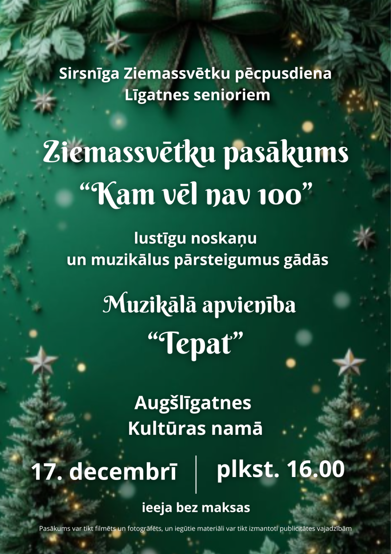 Trešdien, 17. decembrī, plkst. 16.00 Augšlīgatnes Kultūras namā uz īpašu Ziemassvētku pasākumu “Kam vēl nav 100” aicināti seniori.